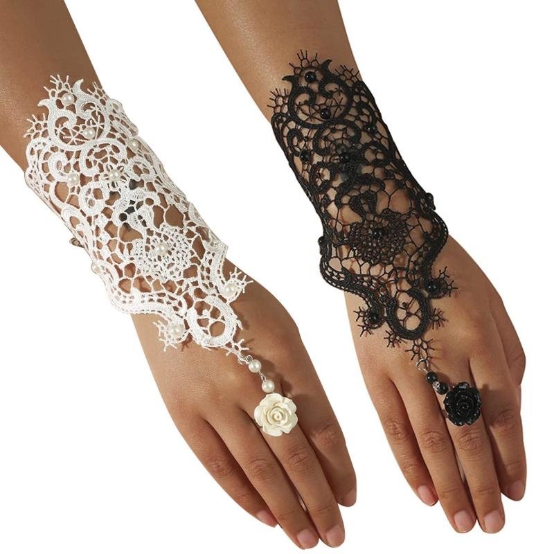2colors Women Rose Beads Flower Lace Gloves Goth Style Adjustable with Ring Long Bracelet Wedding Bridal Accessories