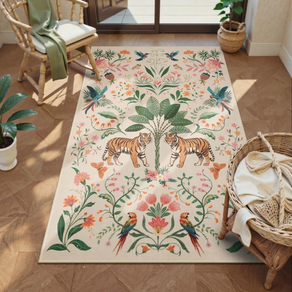Modern Living Room Washable Jungle Tropical Tiger Beige Rug Bedroom Bohemian Style Animal Plant Carpet Retro Home Decoration Rug