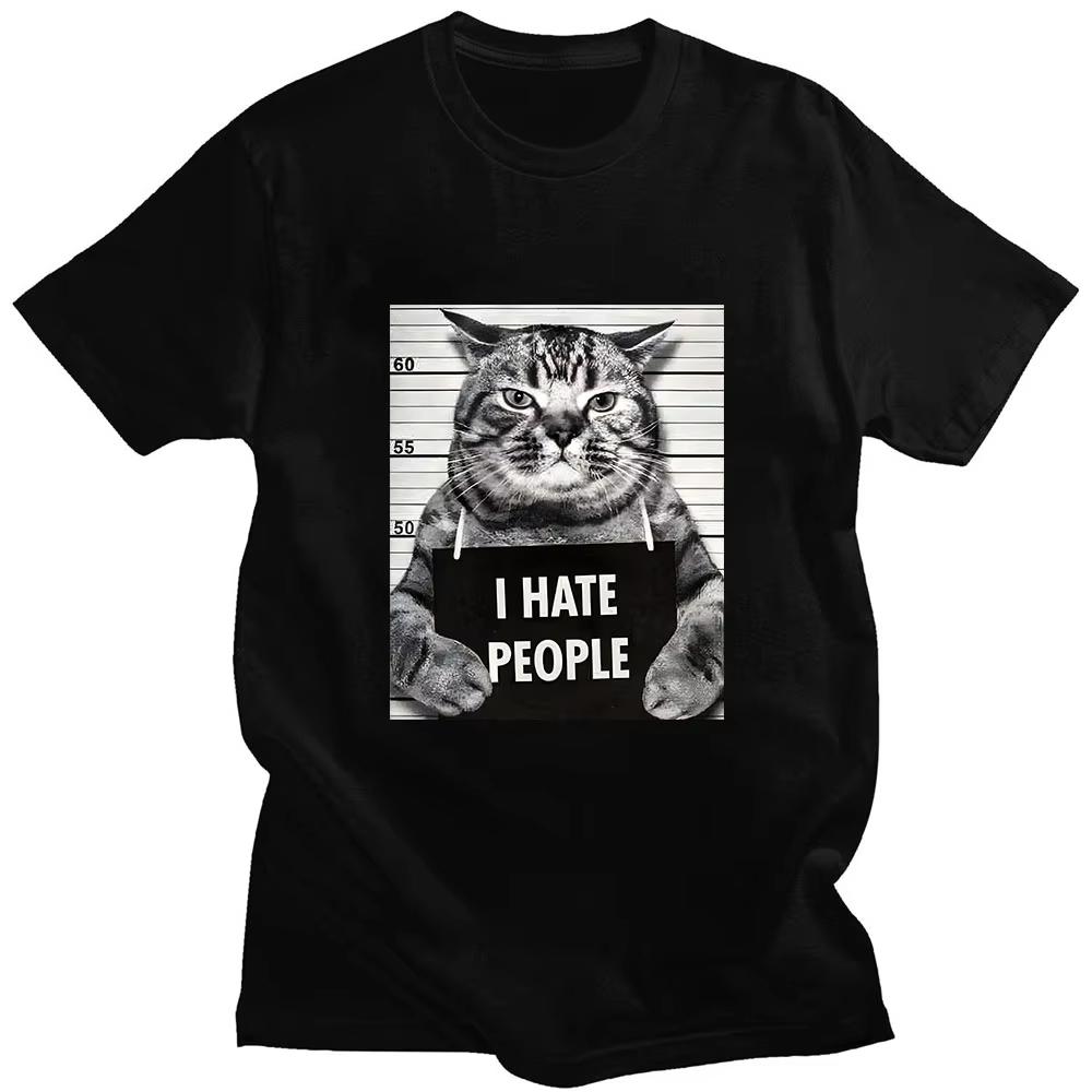 I Hate People Meow Print Men T-shirts Fun Cat Print T Shirts Loose Street Short Sleeve Female/Male Cotton Clothing Casual Tshirt