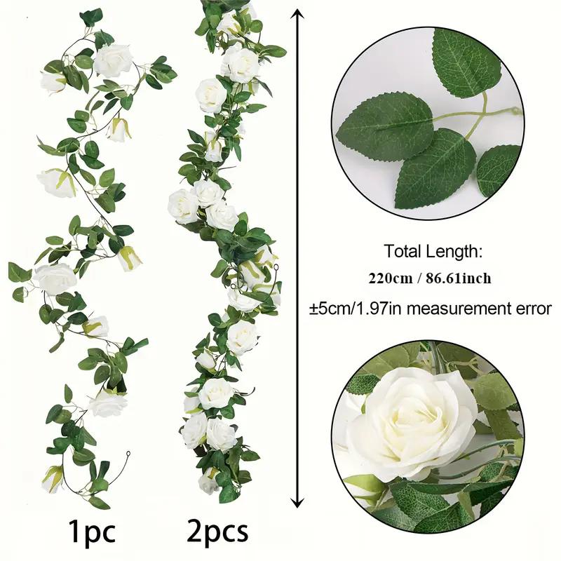 2pcs 86.61inch Artificial Garland - White Roses & Faux Ivy for Outdoor Weddings, Garden Backdrops & Christmas Decor