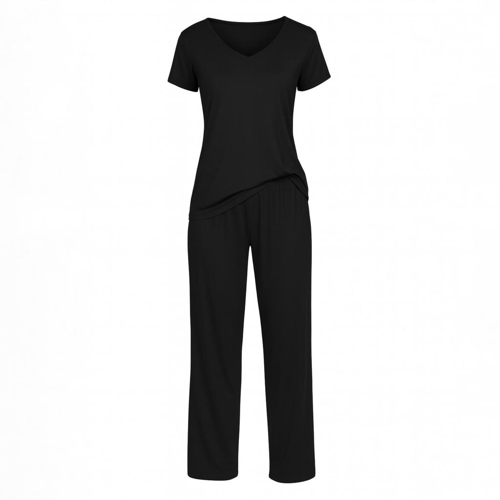 Lightweight and soft. Comfortable for everyday wear. KICKEE's women's V-neck pajama set is both lightweight and soft. Made from bamboo-derived viscose, it's thin yet dense, with a soft, flowing drape. Its smooth, skin-tight fit ensures comfort in any season. The elastic-free waistband provides a comfortable fit without digging in, maintaining a sleek silhouette even over long periods of wear. The short-sleeved top and relaxed-fit long pants allow for easy movement and a stress-free fit. From morning coffee to relaxing evenings, this is a perfect everyday "lounging staple." Whether worn as an inner layer or on its own, it gently hugs your body.