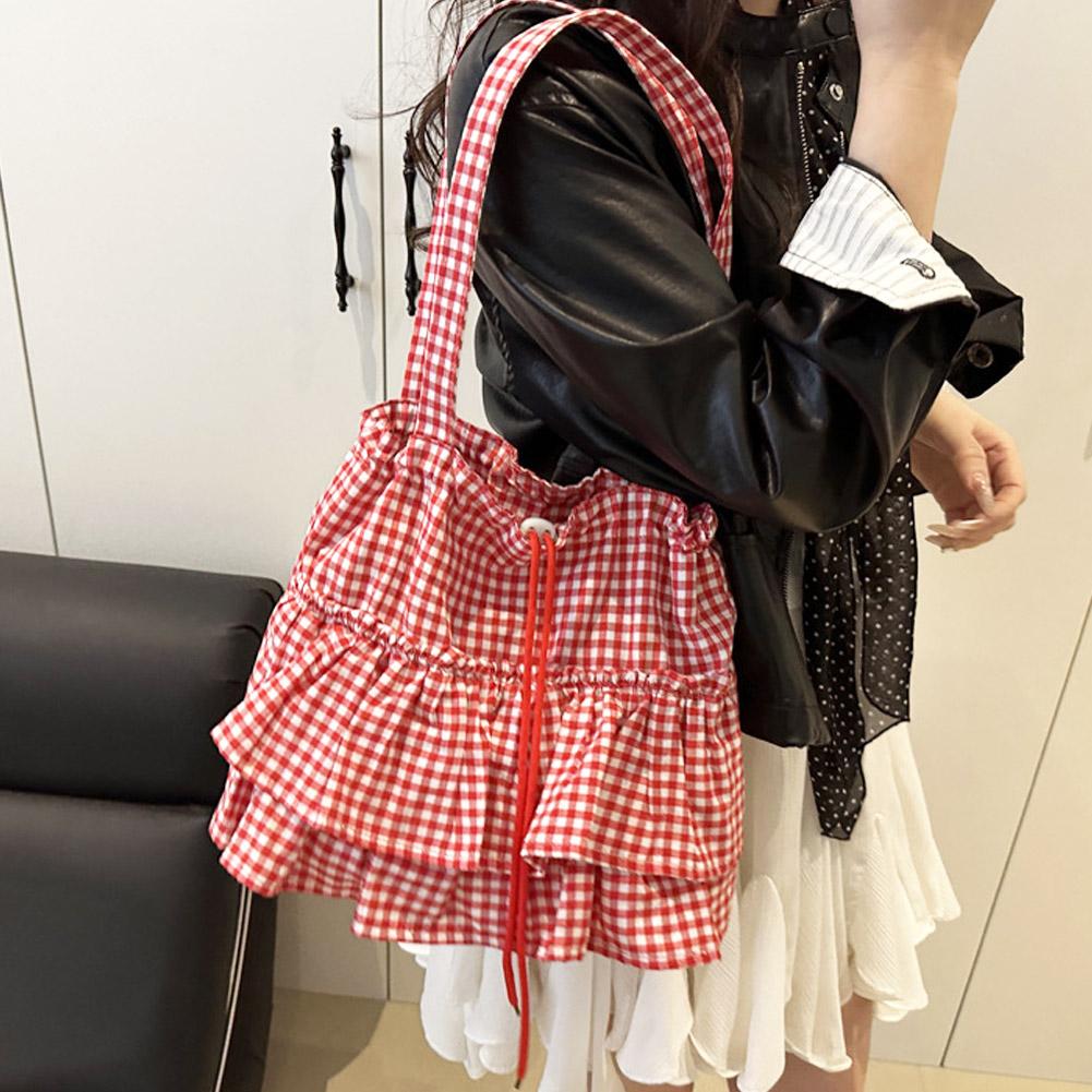 Large Capacity Shoulder Bag Fashion Ruffles Design Casual Lotus Leaf Plaid Shoulder Bag Simple Commute Shopping Bag