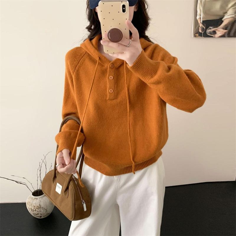 Casual High-end Pullover Sweater for Women's Outerwear Autumn and Winter New Loose Solid Color Hooded Short Knitted Top