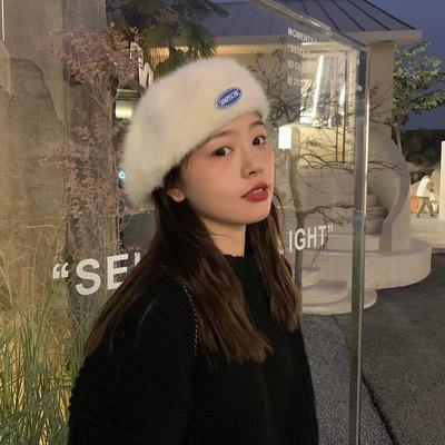 Hat Women's Autumn and Winter Sweet Rabbit Fur Patch Beret Winter Cute Painter Hat Women's Plush Hat