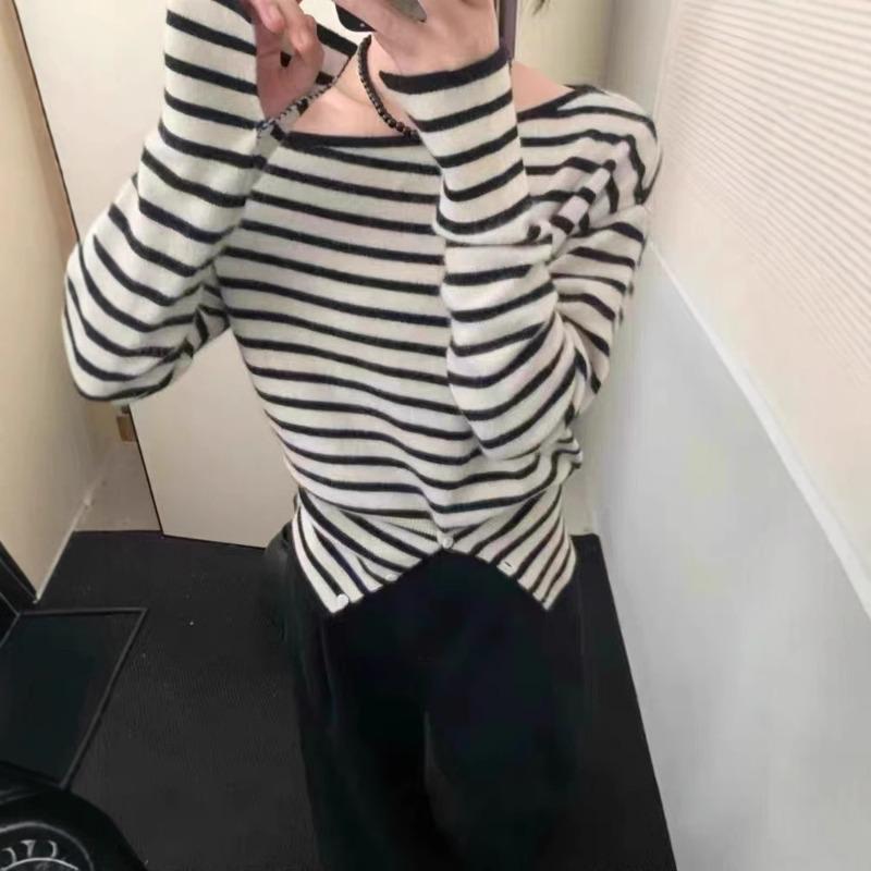 Blended Striped One-neck Knitted Sweater Women's Autumn New Fashionable Pullover Sweater Slim-fit High-end Top