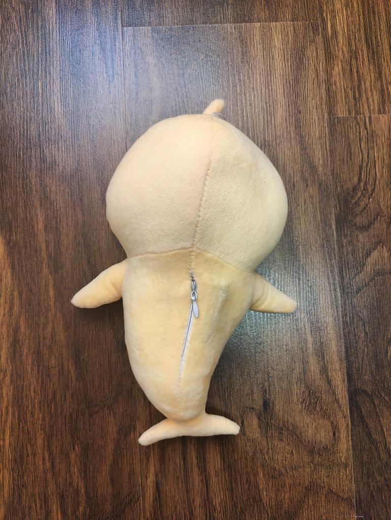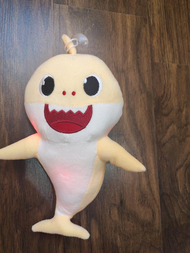 The toy matches the photo. There is a suction cup on top. When you press the hidden button on its belly, music plays and lights flash. Batteries are included. The only thing is, the toy turned out to be smaller than indicated in the seller's description; the size with the top fin is approximately 25 cm, without the fin it's about 22 cm