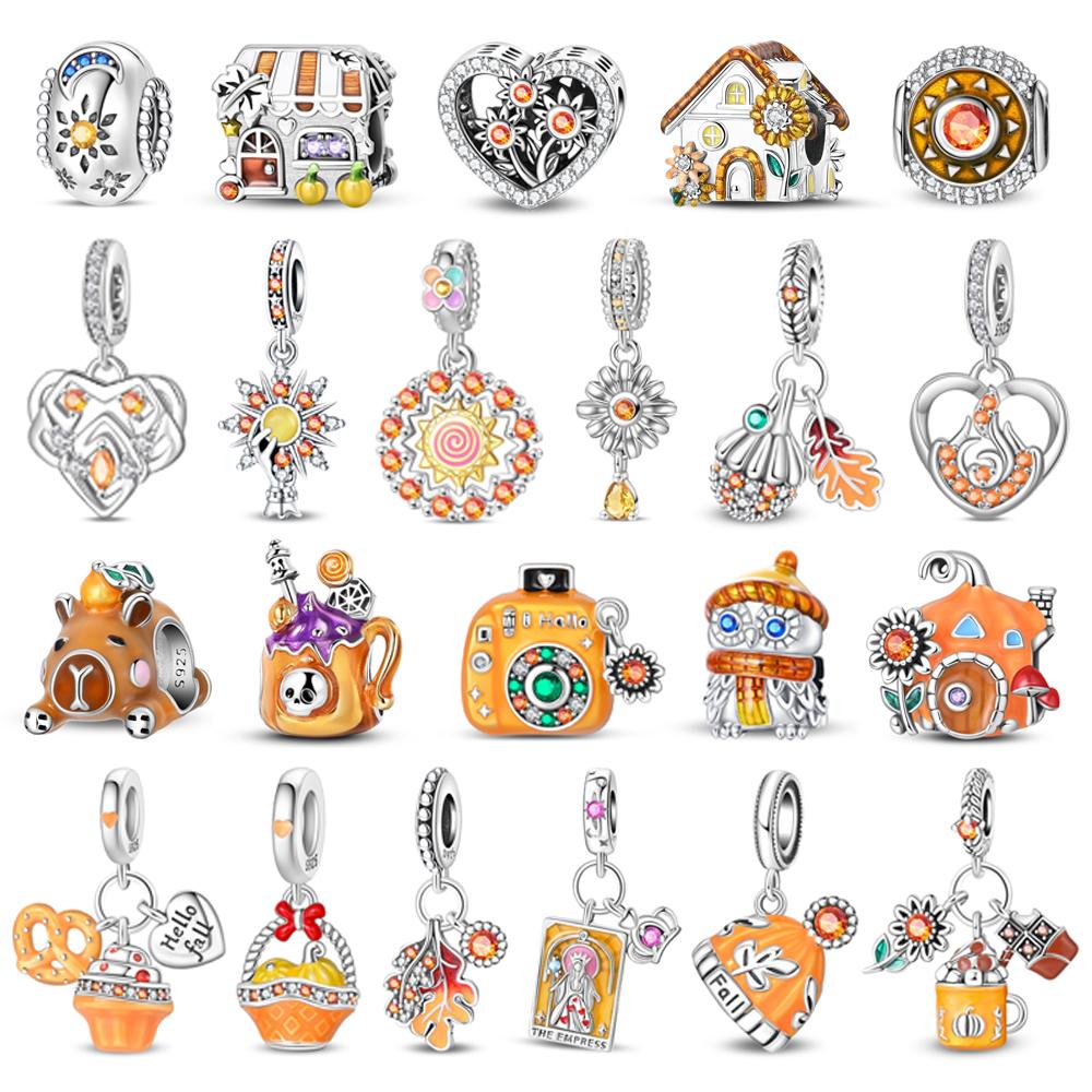 Copper Pumpkin House Beads & Cake Donut Heart Shape Triple Dangle Charm Fits Bracelet Golden Orange Pendant Gifts