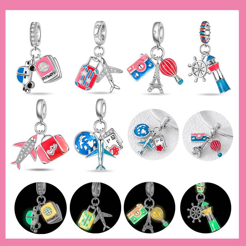 Copper Luminous Travel Series Luggage Plane Car Chain Charms Beads Pendant For Original Bracelet Woman Girl Jewelry