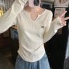 Spring U-neck Irregular Fishbone Line Top Women's Bow Embroidered Long-sleeved T-shirt Sweet Pure Desire Bottoming Shirt