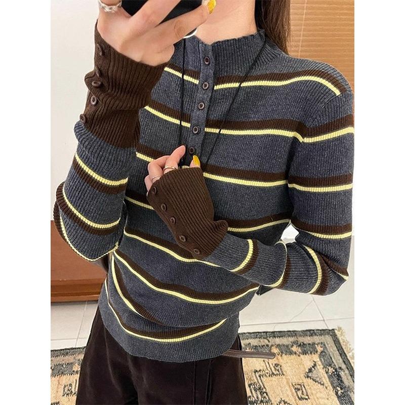 Small Stand-up Collar Stacked with Contrasting Striped Knitted Sweater, Autumn and Winter Button Retro Long-sleeved Top, and Sweater Inside for Women
