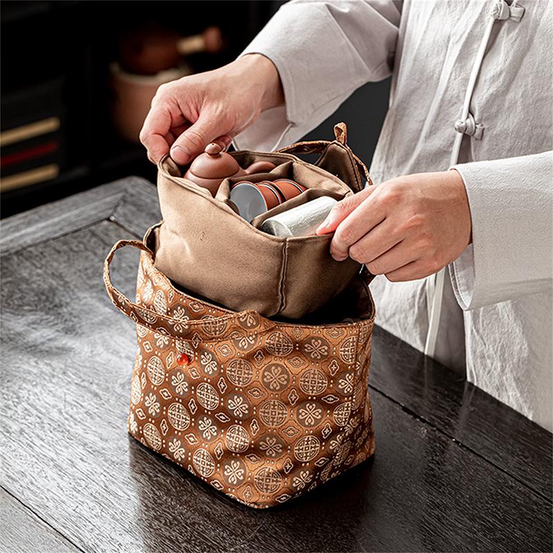 Vintage Zen Style Tea Set Storage Bag, Large Capacity Waterproof Portable Travel Camping Organizer for Teapot Cups Accessories