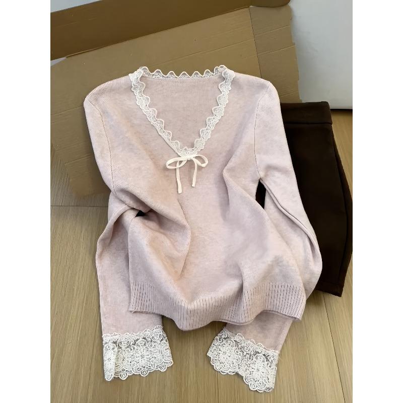Tender Pink Collar Lace Spliced Wool Knitted Sweater for Women's Autumn and Winter Waist and Thin Inner Top, High-end Bottoming Shirt