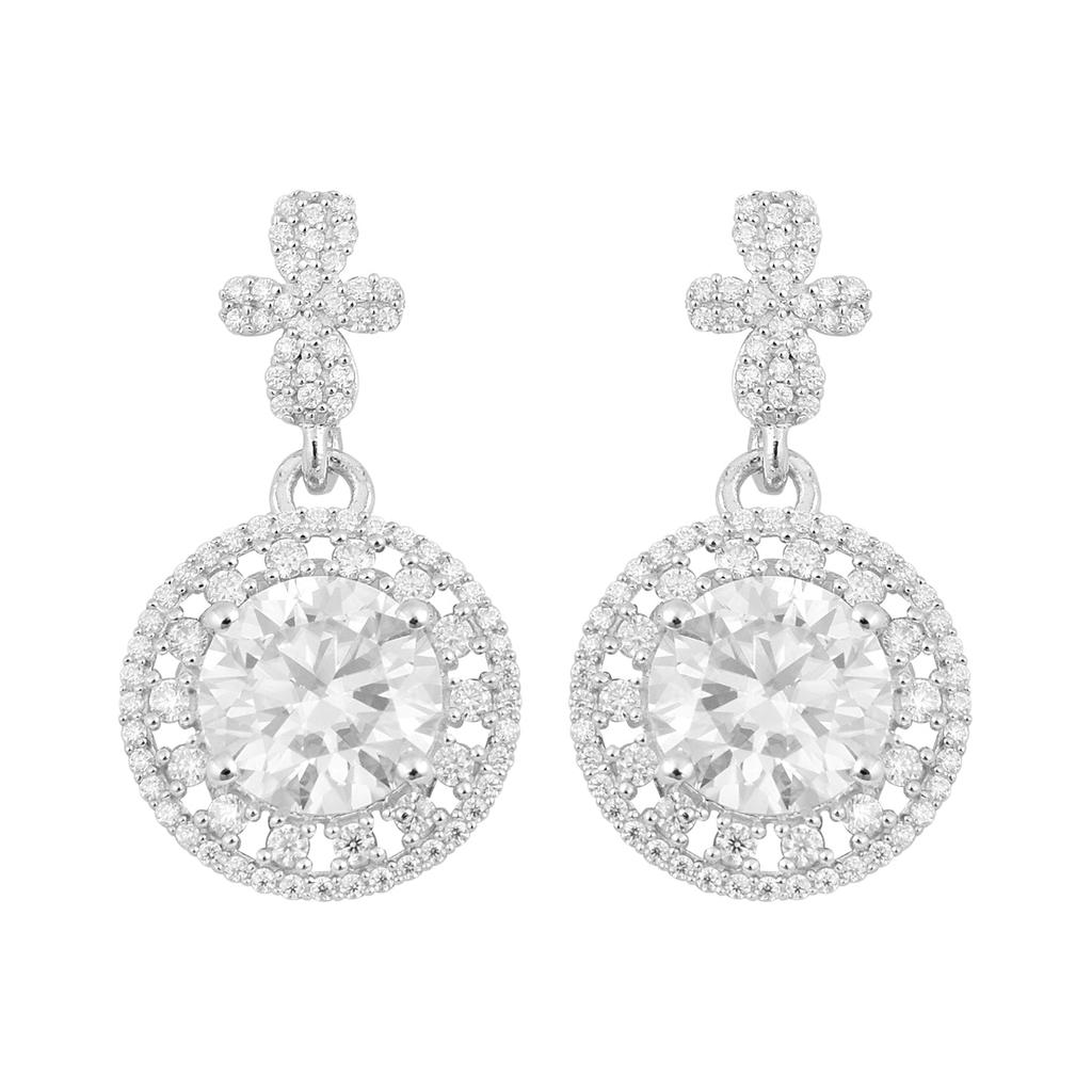 Shop 925 sterling silver drop earrings with 9 MM round moissanites (7.70 Ct total). A stunning floral halo design perfect for weddings and elegant occasions.