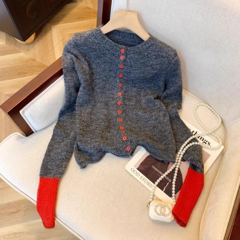 Dark Gray Button Sweater Cardigan Women's Spring Knitted Bottoming Shirt Lazy Wind Contrasting Color Cuff Splicing Top
