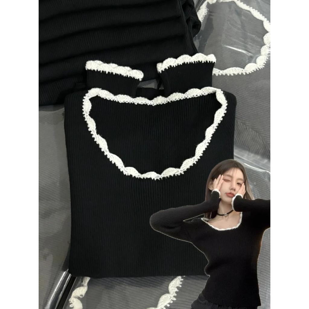 Lace Contrast Low Neck Slim Bottom Top Women's Autumn and Winter Sweet Spice Girl with Skinny Knitted Sweater Sweater
