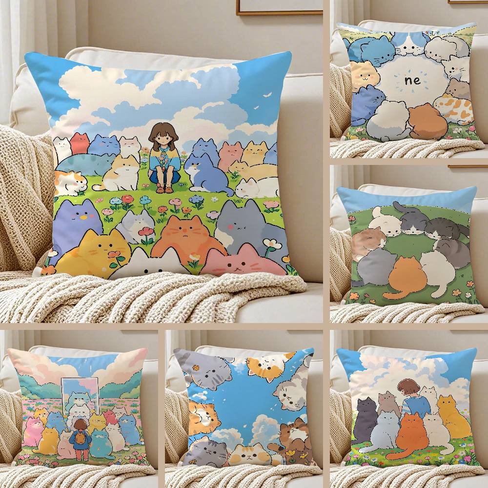 Cartoon Cute Cat Picture With Fresh Pillow Case Anti-dustmite Pillowcase Invisible Zipper Silky Short Plush Sofa Cushion Cover