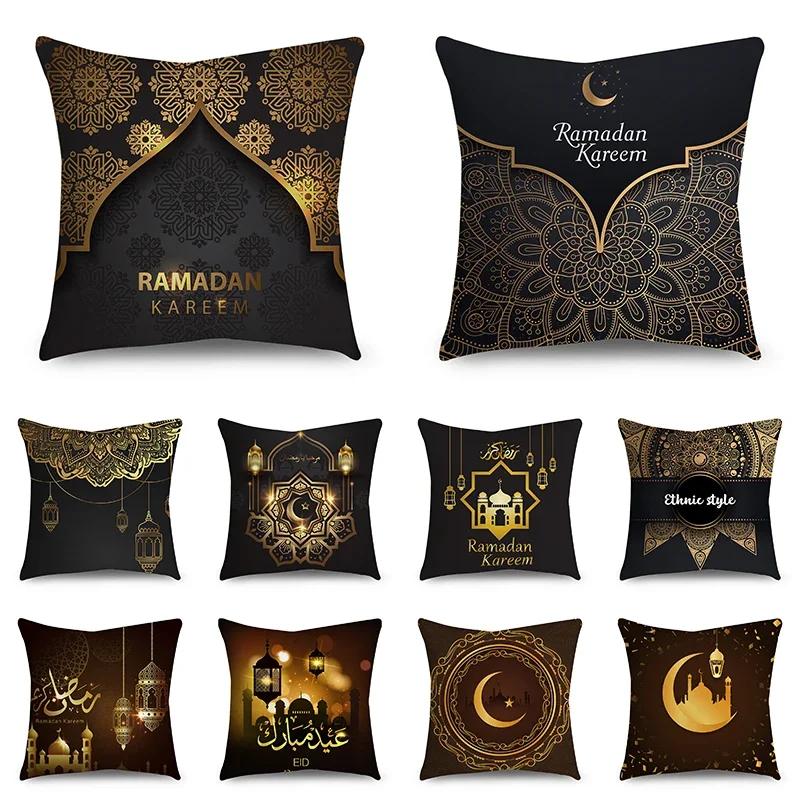 Ramadan Cushion Cover Islamic Eid Mubarak Black Gold Pillow Covers Home Decor Sofa Decorative Short Velvet Pillowcase 45cm*45cm