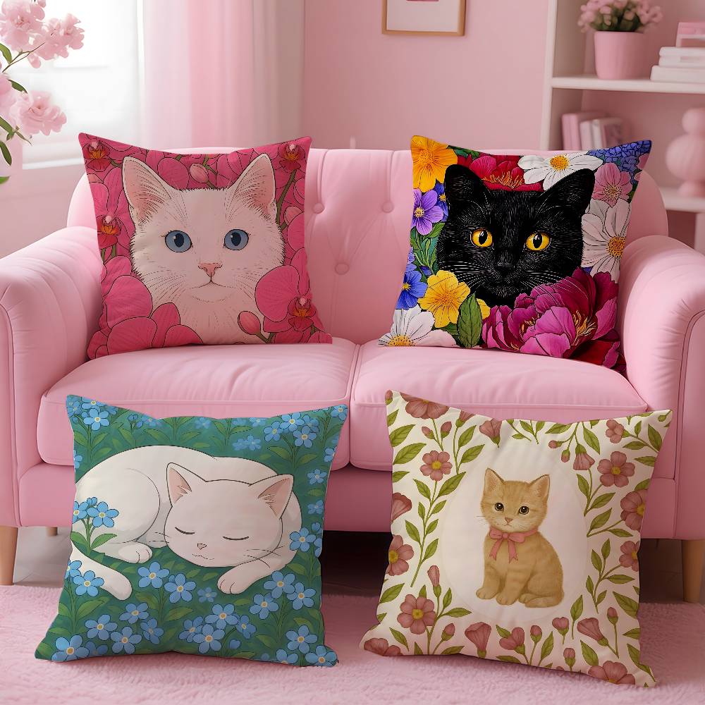 Cat In the Flowers Aesthetic Pillow Case Anti-dustmite Pillow Invisible Zipper Silky Short Plush Sofa Cushion Cover