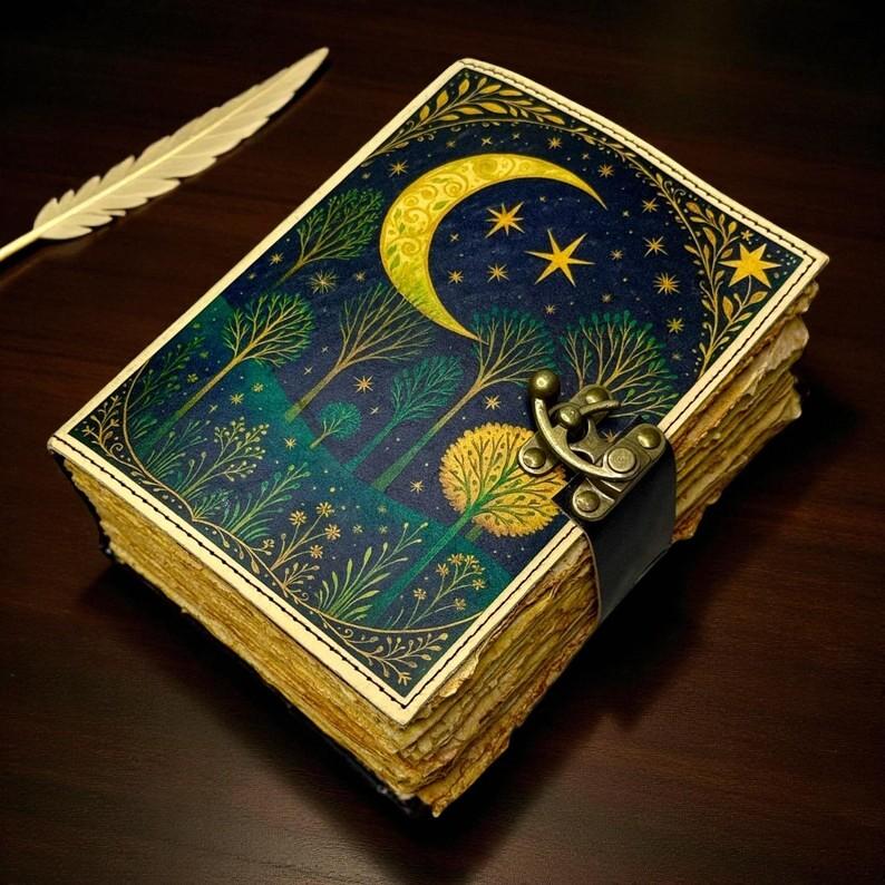 Enter a world of quiet magic with this Handmade Leather Moonlit Forest Journal, a breathtaking artisan-crafted notebook designed for writers, dreamers, artists, and lovers of nature’s nighttime beauty. The cover features a glowing crescent moon surrounded by golden stars, rising above a mystical forest painted in deep shades of blue, green, and gold. Every detail—from the delicate leaf patterns to the shimmering tree silhouettes—evokes the serenity of a starlit night.