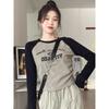 Spring Niche Shoulder Sleeves Contrasting Color T-shirt Women's Waist Pleated Top Personalized Printing Bottoming Long Sleeves