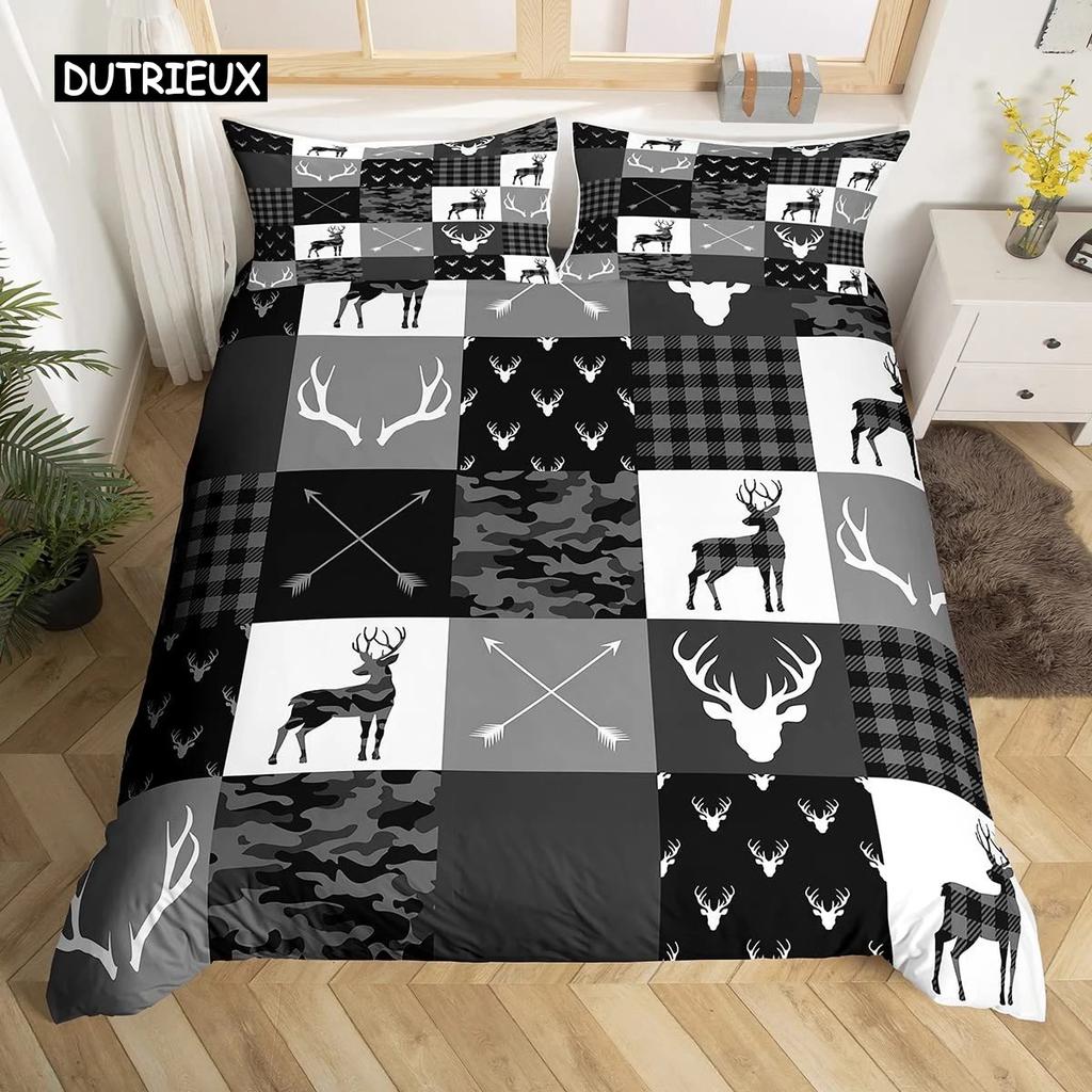 Camo Deer Duvet Cover Set Antlers Arrow Pattern Bedding Set Stripes Gird Camouflage Comforter Cover Microfiber King Quilt Cover