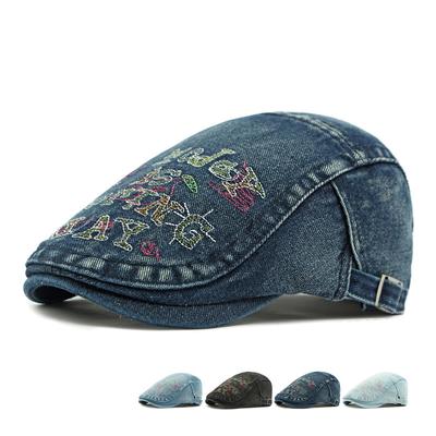Embroidered Letter Denim Beret Women's British Peaked Cap Men Vintage Progressive Hat Painter' S Cap