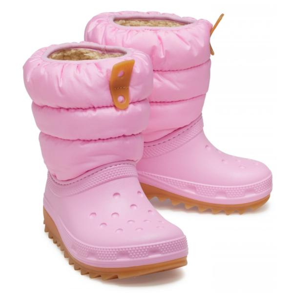 The Crocs Classic Neo Puff Boots for kids are designed as children's boots, made with an upper of 95% ethylene-vinyl acetate and 5% polyester. The lining is 100% polyester, designed with Croslite material for comfort. It comes in various size options.