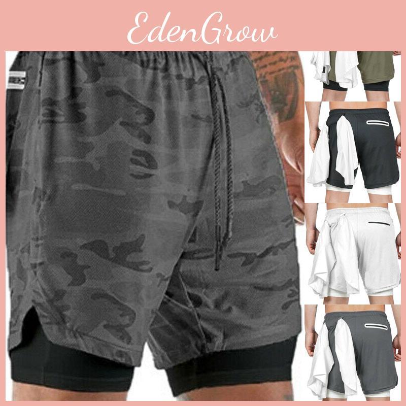 Men's Camo Running Double-deck Stretchy Quick Dry Gym Shorts With Secure Phone Bag