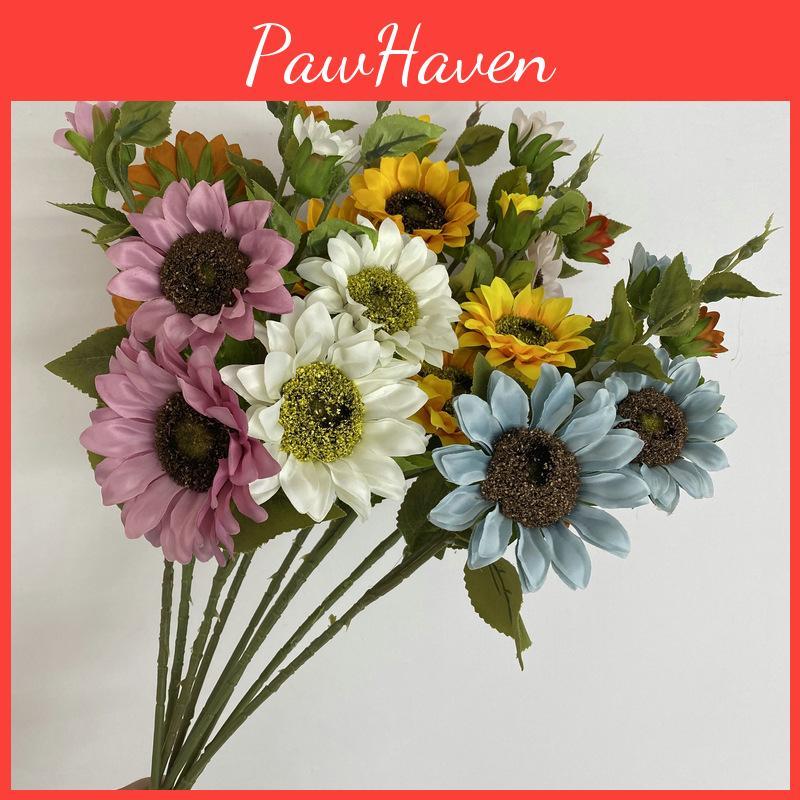 The Fake Sunflower Bouquet features realistic, durable faux flowers in vibrant colors including caramel, blue, white, yellow, pink, orange, and purple. Made of high-quality fabric and plastic, each bouquet measures approximately 65 cm in length, ideal for decorative and photography use. This versatile arrangement enhances home dcor and event setups. Easy to maintain, it can be wiped clean with a damp cloth to preserve its appearance.