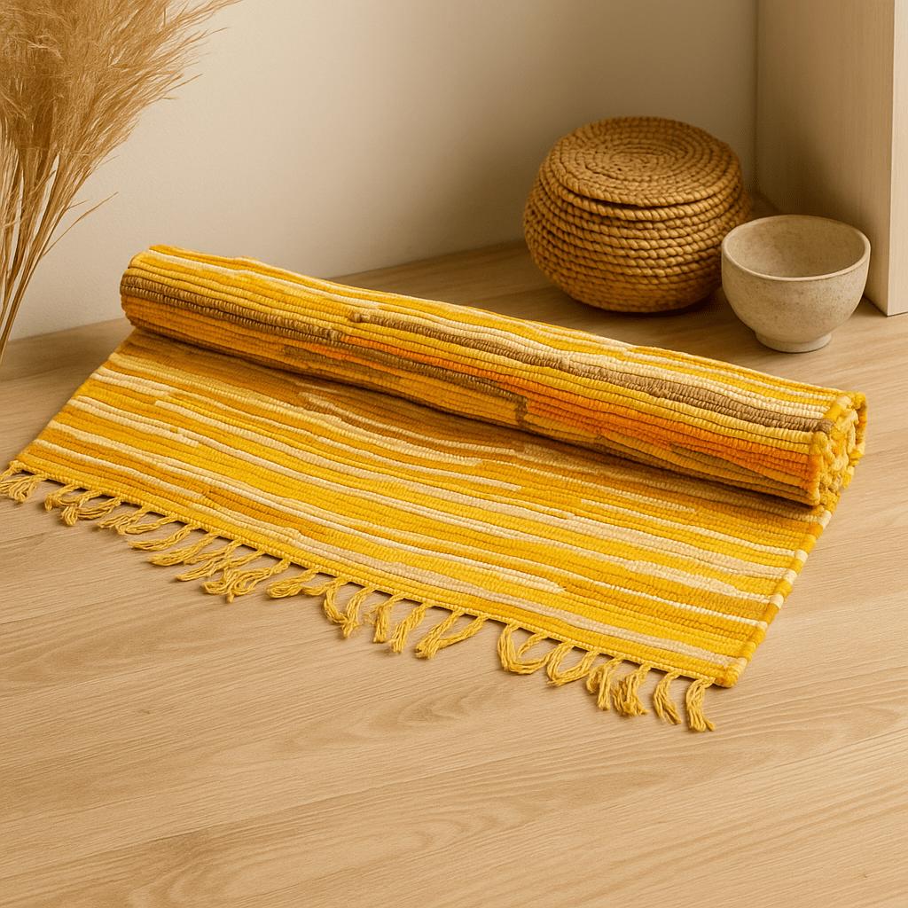 Each piece is woven from varied textiles, creating horizontal bands of yellow and orange with gentle whites and occasional darker flecks. The flat, tightly woven surface feels sturdy underfoot while adding inviting texture to the room. Slight irregularities in stripe width and tone celebrate the maker’s hand and the fabric’s second life. As with all true handwoven rag rugs, colors and sizes may vary a little, giving every rug its own character and story of renewal.