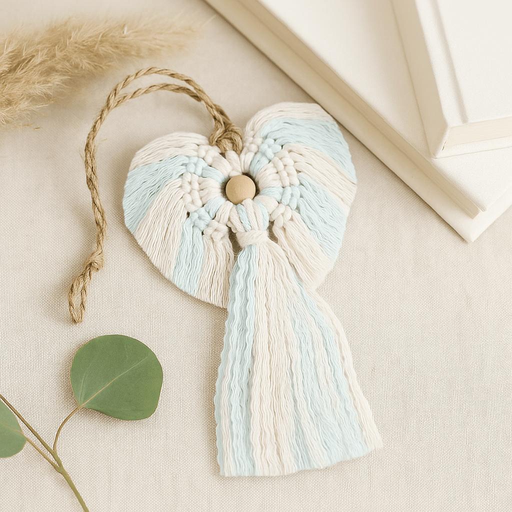 Airy macramé reveals subtle pattern: a scalloped, fan-like top in alternating soft blue and cream, a smooth central bead, and a long, wavy tassel that sways lightly with the room. Natural cotton lends depth and softness, catching light across its textured strands. The vertical fall draws the eye downward, offering a grounded sense of balance and presence. Its calm palette slips easily into bohemian corners, rustic wood settings, or pared-back minimalist rooms. Across cultures, the angel motif is associated with care, guidance, and protection—a quiet reminder of compassion often kept by doorways or places of rest. 🕊️