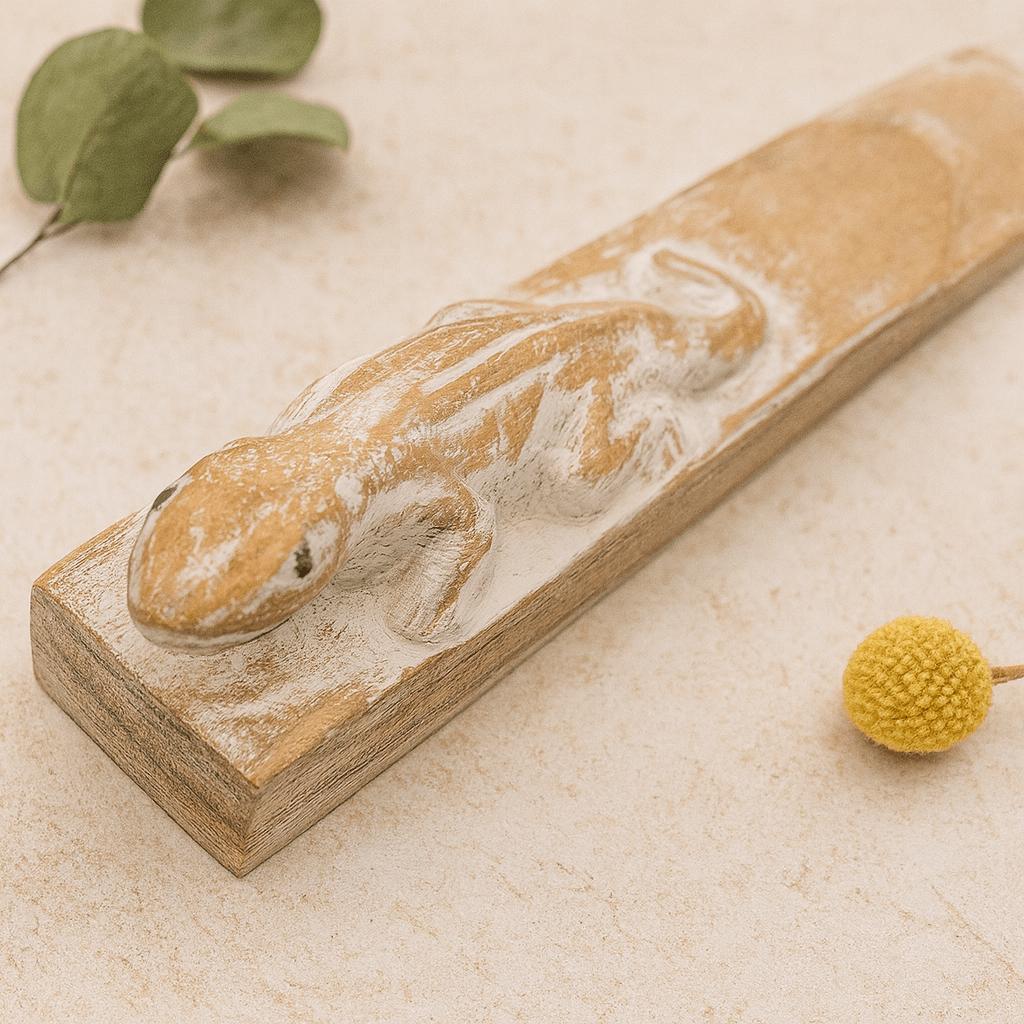 🪵 Hand-carved in Indonesia from solid wood, it carries a natural light-brown tone brushed with a whitewashed, gently distressed finish. The visible grain and slightly weathered surface feel grounded to the touch. Along the top, a low-relief gecko curls in an elegant line, with incised eyes and a softly curved tail. The rustic character pairs easily with coastal, bohemian, and modern-natural spaces, adding warmth without clutter.