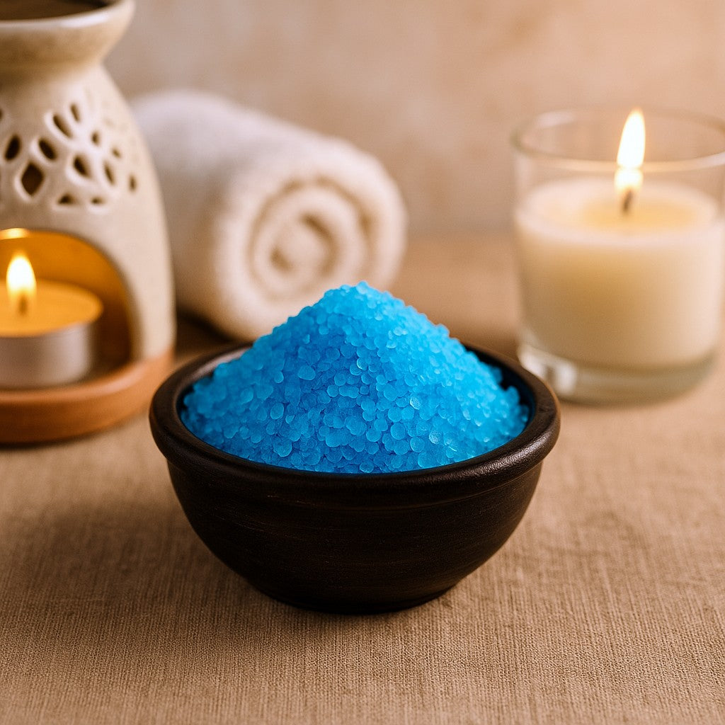 The granules are bright blue and crystalline to the touch — coarse, irregular, and easy to measure. Place a small spoonful in the reservoir of your oil burner and warm gently; no water or extra oil is needed. The scent releases slowly and evenly, uplifting without overwhelming, and cools to a dry finish for effortless tidy-up. No spills, no oily residue — just a clear, comforting freshness that lingers. 🕯️