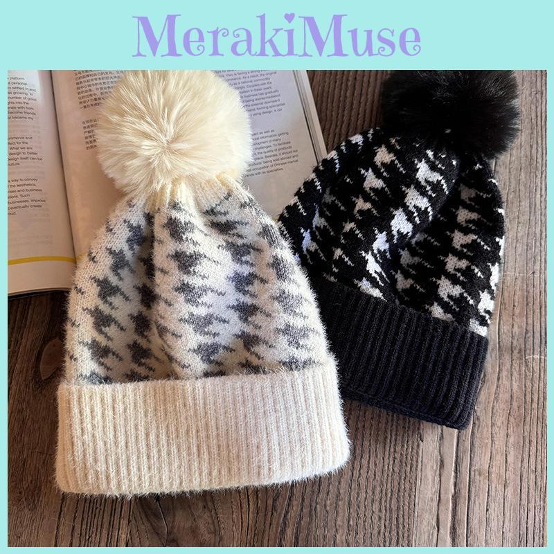 Retro Houndstooth Knit Cap For Women With Warmth And Fashionable Design For Autumn