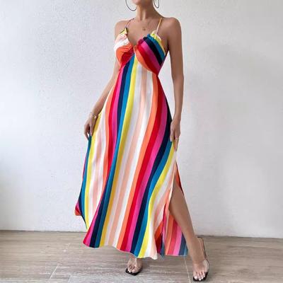 Women's Summer Halter Deep V Rainbow Casual Long Dresses