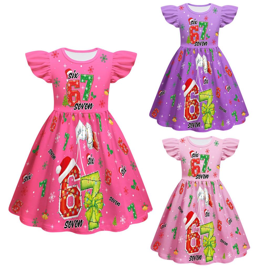 82839 Kids Girls Christmas Steal a Brainrot 67 Six Seven Print Ruffle Sleeveless Princess Dress