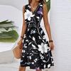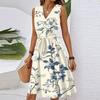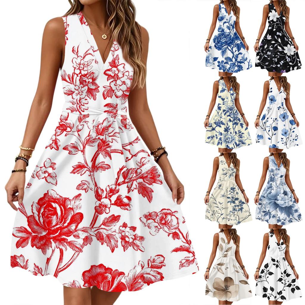 Women's Summer Fashion Loose V-Neck Sleeveless Lace-Up Floral Print Dress