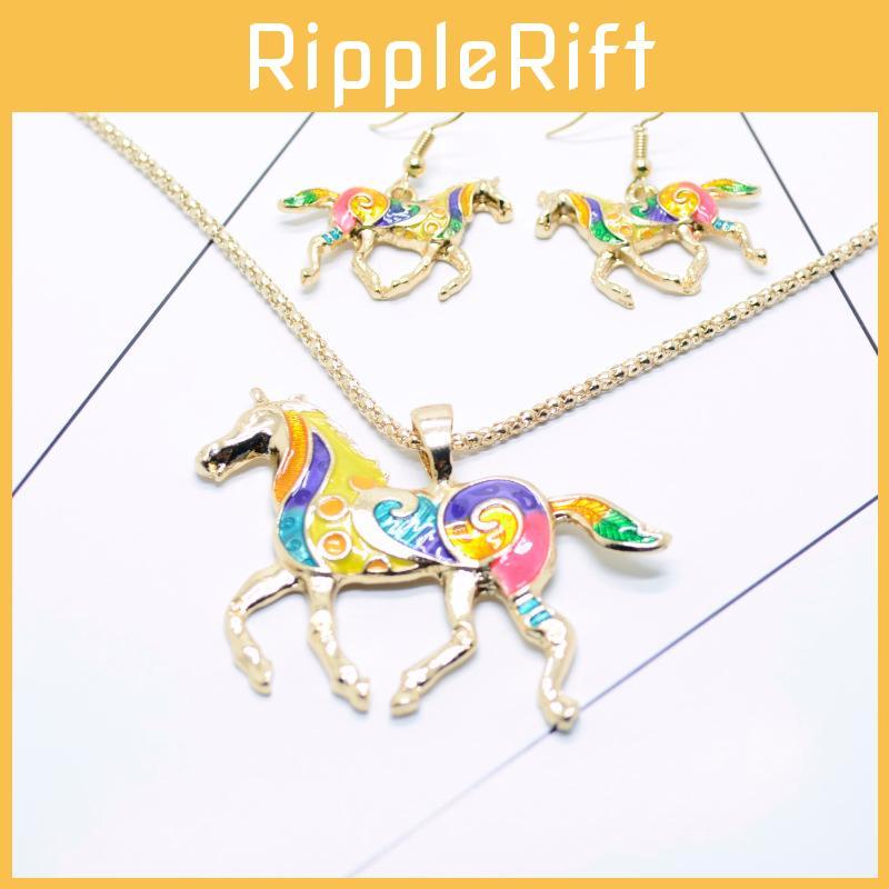 Trendy Rainbow Pony Pendant Earring Necklace Set With Colorful Gradient Design