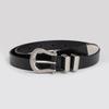 This women's high-quality leather belt features a durable two-layer bovine leather construction, measuring 105cm in length with a width of 1.8 cm, and is accented with a polished alloy round buckle. Designed for business and casual wear, it enhances professional outfits with a vintage geometric style. Ideal for daily office or formal occasions, it supports easy adjustments via a pin buckle. Wipe clean with a damp cloth to maintain its appearance.