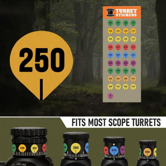 This features 37 color-coded stickers ranging from 100 to 1000 yards/feet in 25-unit increments, designed to enhance your shoot precision. Easily apply these scope cover stickers to your scope for quick distance dialing—no batteries or calculations needed.