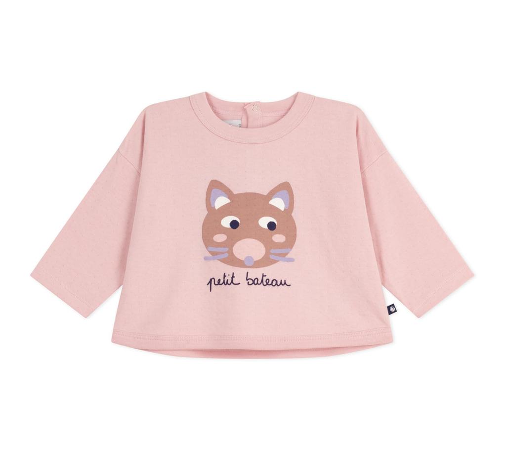 This long-sleeved T-shirt features a cute animal print. Made with soft, eco-friendly cubic fabric, which is knitted from two layers of fabric, it's known for its comfortable fit. The snap buttons on the back make it easy to put on and take off. This convenient item can be worn on its own or as an inner layer, making it a great gift or for everyday wear. *Cubic (bonded) fabric is knitted from multiple layers of thin fabric. Please note that the threads in the bonded areas may be visible through the material, and the surface may become wavy after washing.