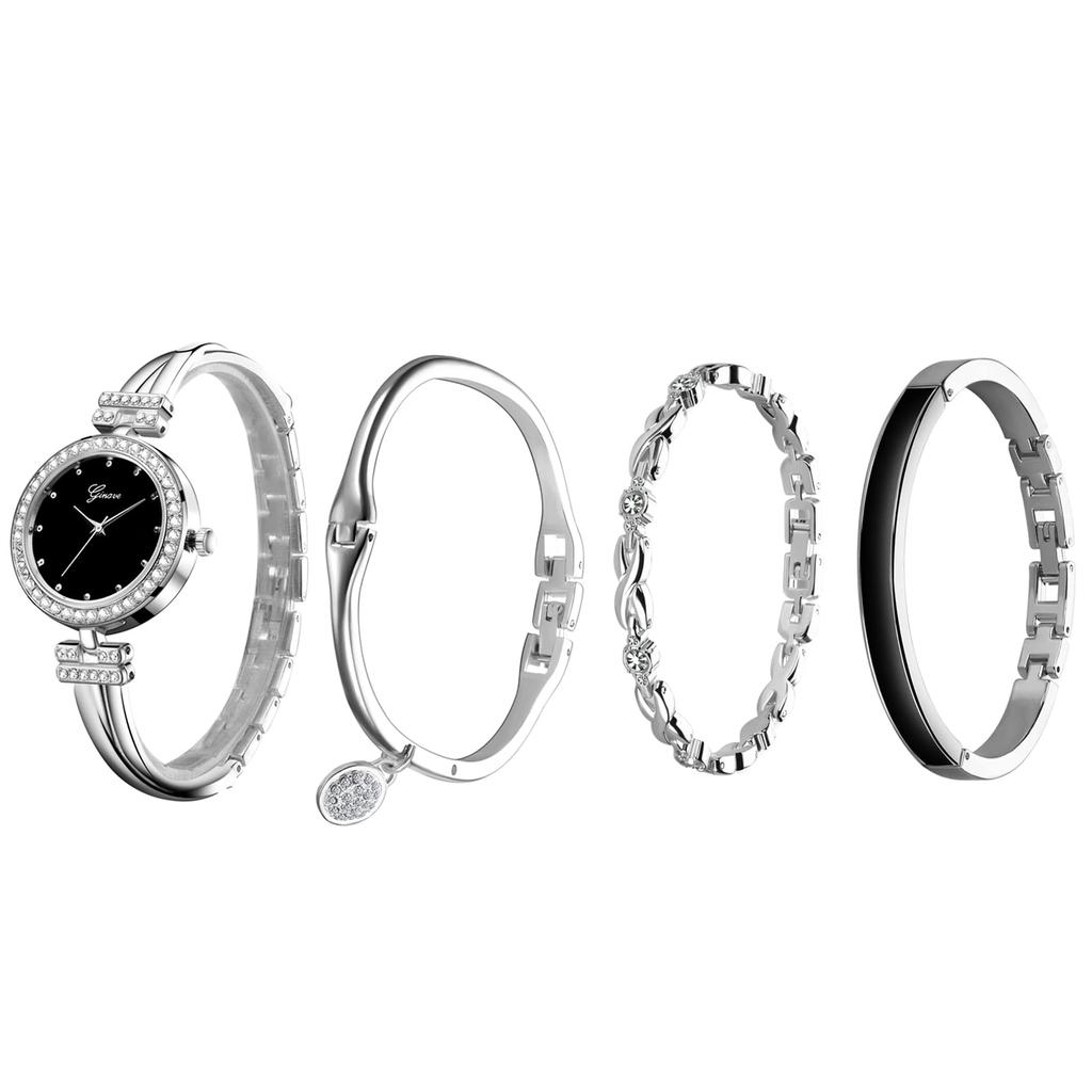 JEWELRYWE Watches and Bangle Simple and Analog Perfect Gift for and Day Women's Set, Cute, 4-Piece Set, Display, Waterproof, Popular, Stylish, Silver,