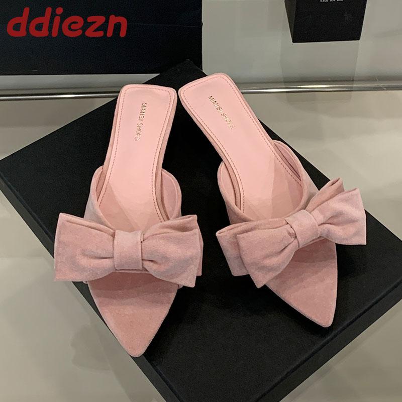 Fashion Fashion Butterfly-Knot Women Low Heel Slippers Shoes Female Slides Sandals Pointed Toe Footwear Ladies Heeled Slippers Shoes