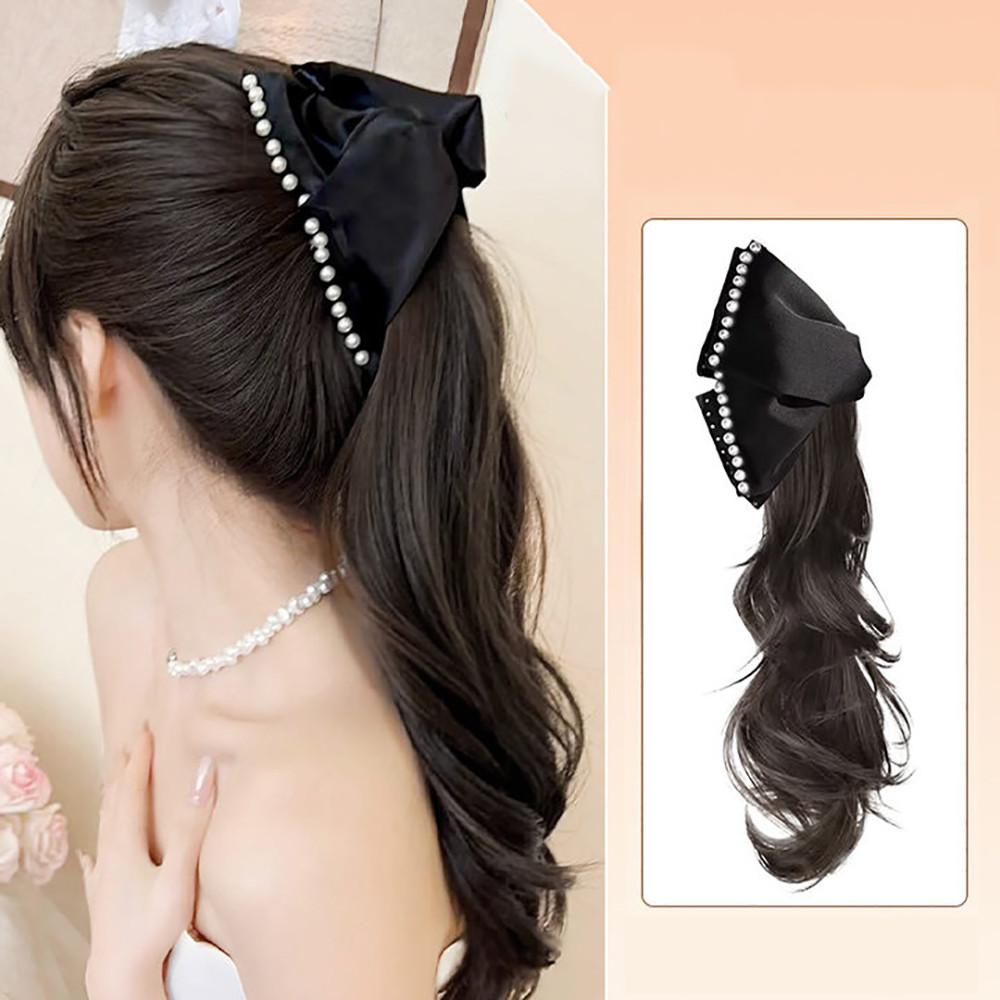 Synthetic Wig Elegant Women Pearl Black Bow Clip Curly Wig Natural Wavy Fake Ponytail Grabber Extension