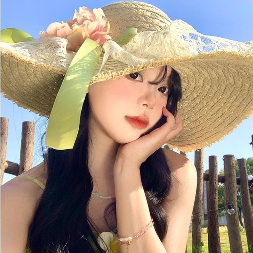 Summer Flower Lace Bow Fresh Straw Hat Women Seaside Vacational Sunshade Beach Hat