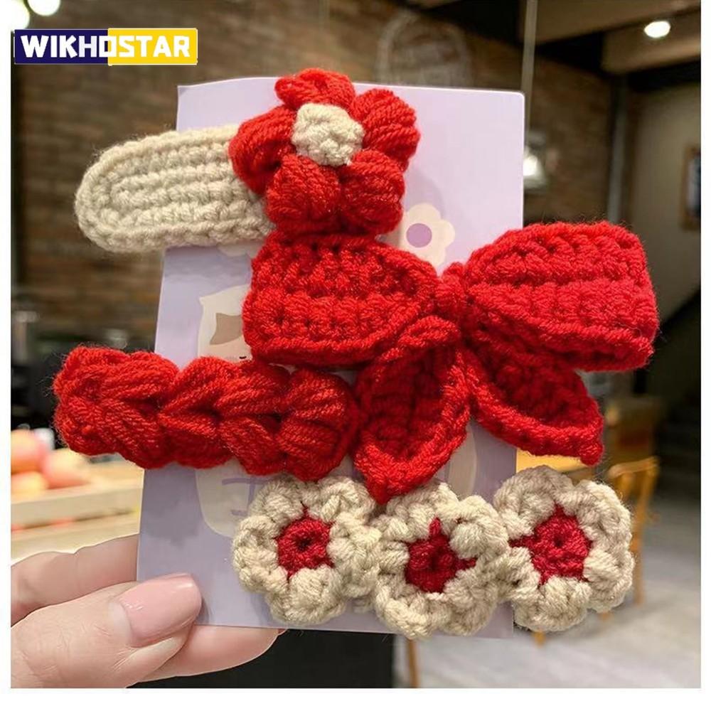 4Pcs Cute Knit BB Hair Clips, Handmade Flower Border Clips,Bow Bang Clips for Kids,Suitable for Chrismas Festival Celebration