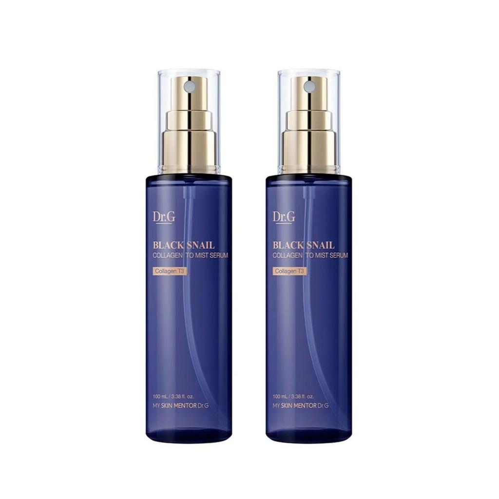 Dr.G Black Snail Collagen To Mist Serum is a dual-function hydrating mist and serum designed to replenish moisture, improve elasticity, and revive tired skin. Formulated with Black Snail Extract, Collagen, and soothing ingredients, it helps smooth texture, boost firmness, and deliver a healthy, radiant glow. Its ultra-fine mist allows even, refreshing application anytime throughout the day, making it ideal for both skincare routines and on-the-go hydration. This value set includes two full-size 100ml bottles.