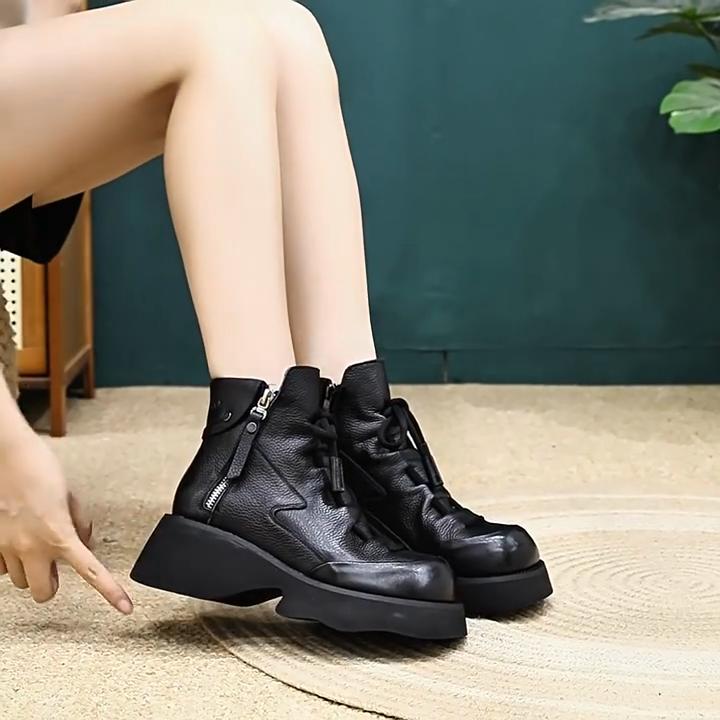 Johnature Genuine Leather Retro Wedges Short Boots With Side Zipper Thick Soled Versatile Women's Boots