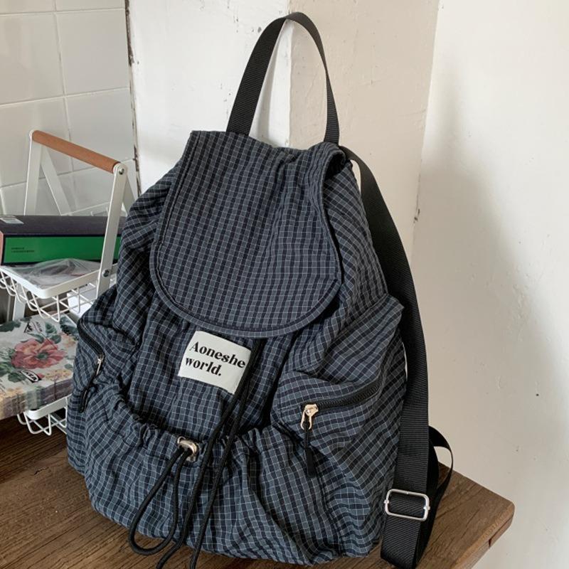 Lightweight Nylon Plaid Backpack, New Large-capacity Lazy Style Versatile Drawstring Tote Bag