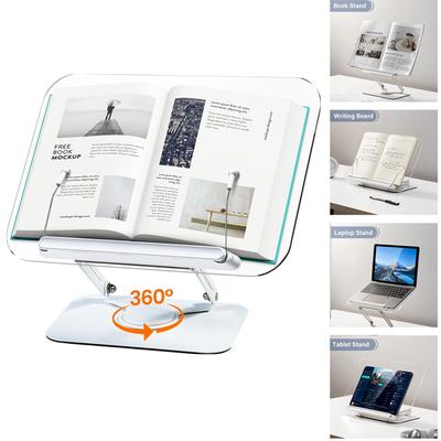 New Acrylic Book Stand for Reading Adjustable Book Holder with 360° Rotating Base Elastic Page Clips Foldable Laptop Stand